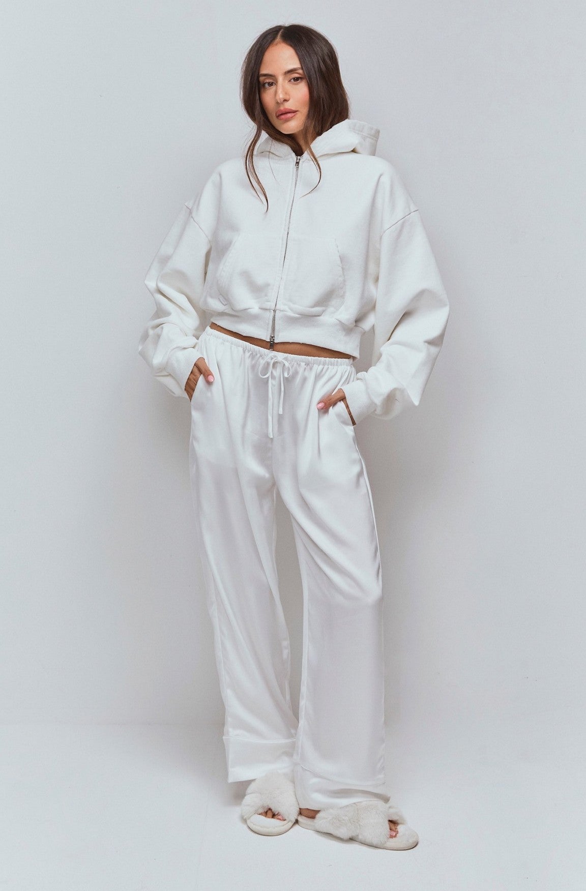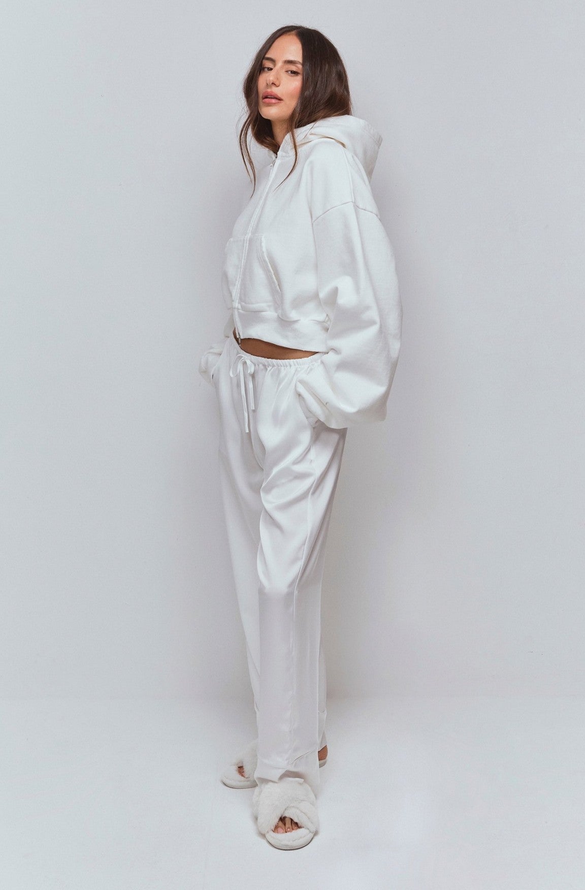 Oversized cropped hoodie with puffed sleeves and a two-way zip for easy styling.