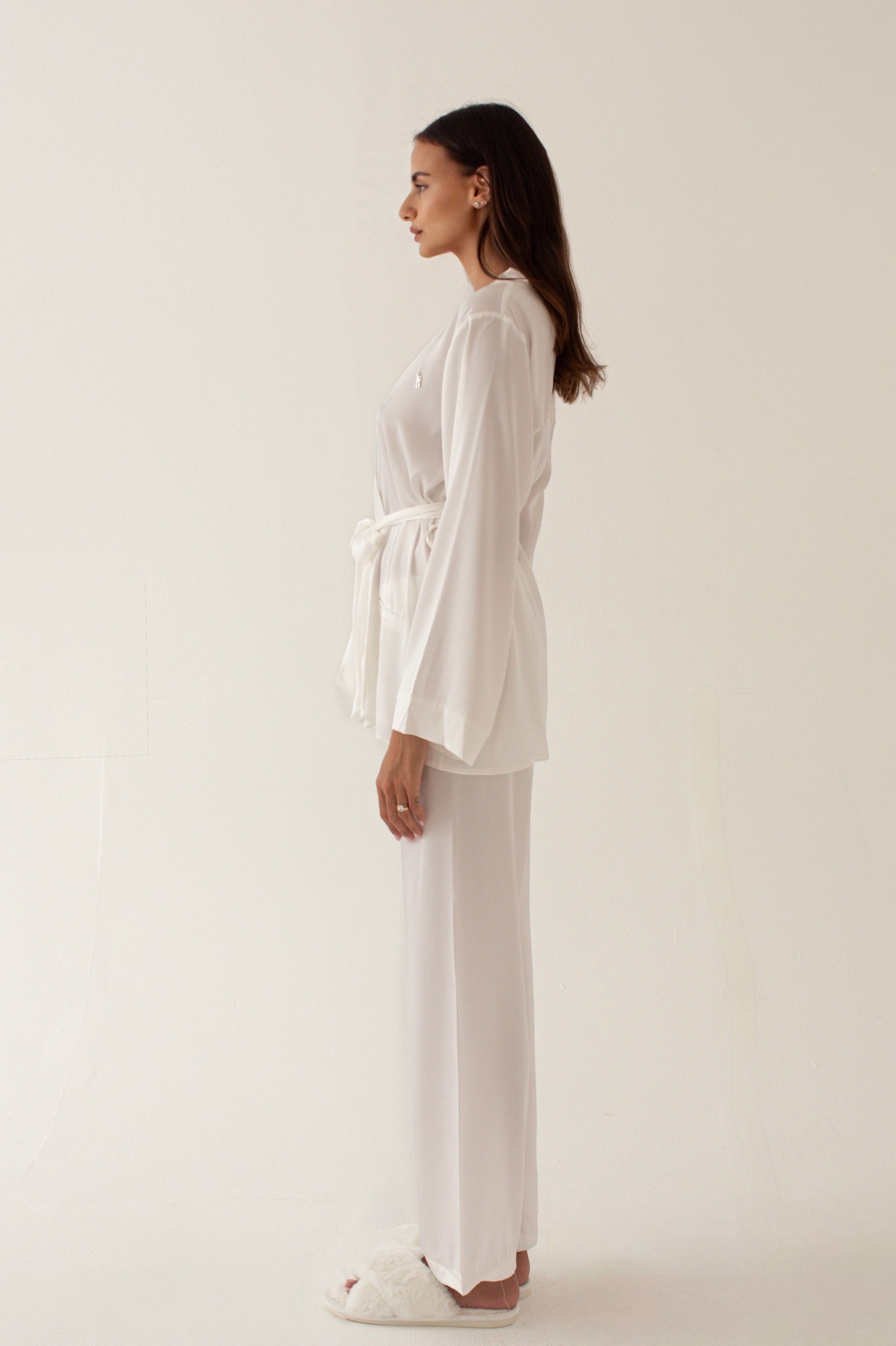 Get ready for your special day in utmost luxury and comfort with De Bride Set, featuring a luxurious silky robe with delicate inner and front ties, paired with sleek straight-cut trousers.